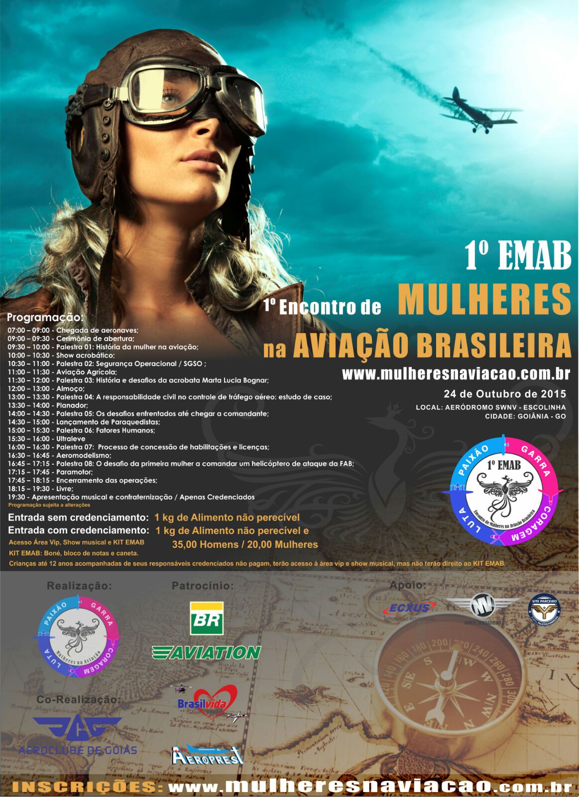 O I Encontro de Mulheres na Aviação será realizado em Goiânia dia 24 de Outubro de 2015, das 07:00 às 18:15 no aeródromo nacional de aviação – SWNV .