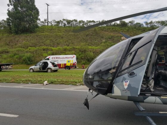 Uma mulher de 23 anos ficou presa às ferragens e foi socorrida por bombeiros, equipe de resgate da CCR RodoNorte e pelo serviço aeromédico do Batalhão de Polícia Militar de Operações Aéreas (BPMOA).