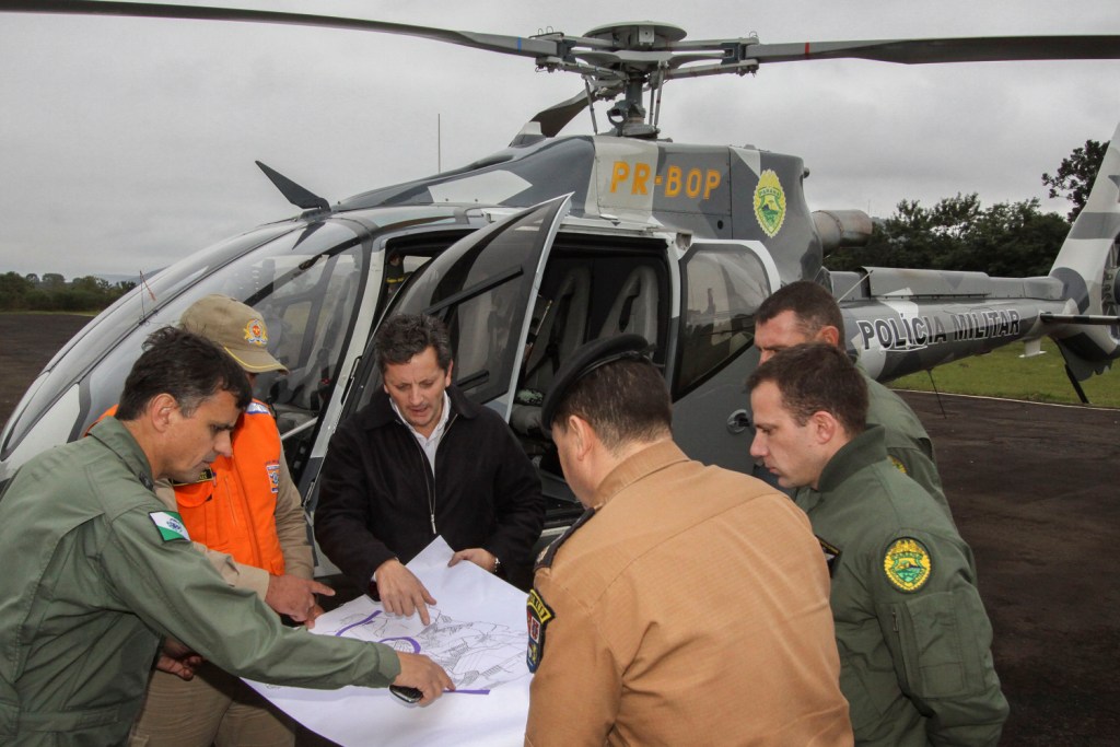 Defesa Civil, Corpo de Bombeiros, Polícia Militar e Grupamento Aéreo reforçam as acões do Governo do Estado às necessidades da prefeitura e da população de União da Vitória com a enchente do Rio Iguaçu. Na foto, ten-coronel Artur, capitão Guimarães, da Defesa Civil e o comandante da 2.Companhia Independente de União da Vitória, major Emerson.