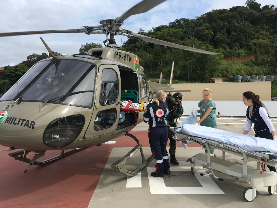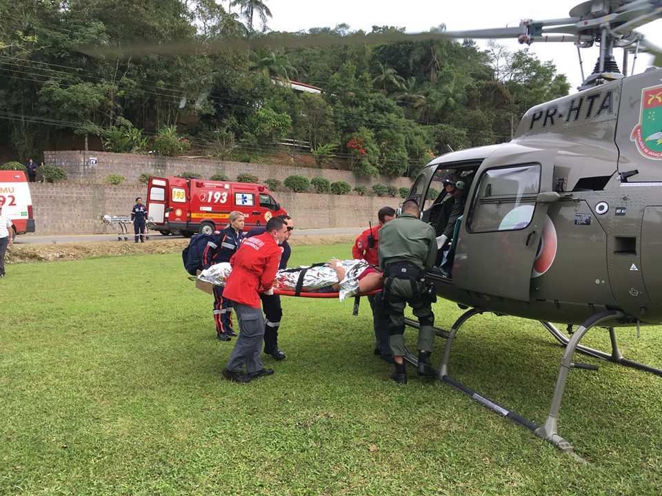 No local, a vítima estava sendo atendida pelo SAMU e pelos Bombeiros. Com o pouso do helicóptero, a vítima foi embarcada e conduzida para o Hospital São José em Jaraguá do Sul.