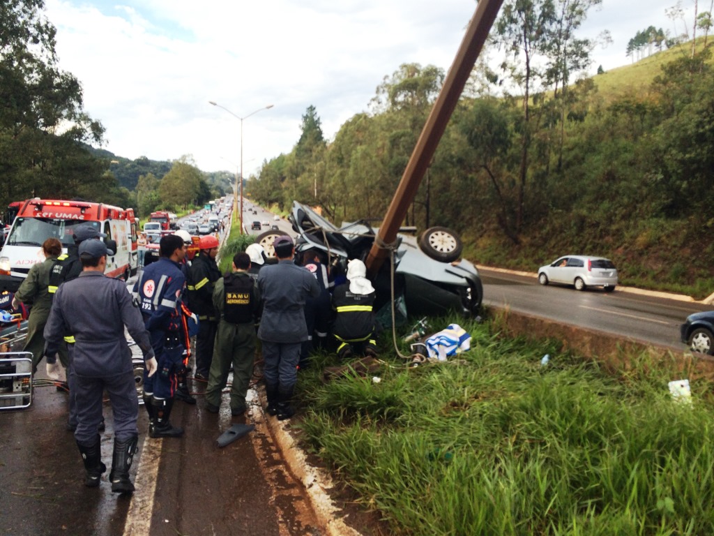 A passageira do automóvel faleceu no local e o motorista ficou preso às ferragens. A pista da rodovia precisou ser interditada para o pouso da aeronave.
