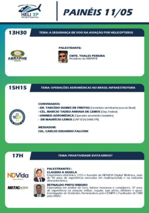 O primeiro painel será sobre Operações Aeromédicas no Brasil – Infraestrutura e serão abordadas as dificuldades enfrentadas pelos operadores na realização de suas missões aeromédicas. Representantes da Unimed Aeromédica e da Unidade Aérea Pública da SESA/SAMU Paraná participarão dos debates.