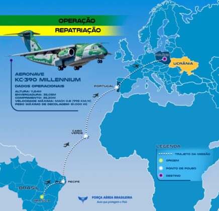 Um dos cinco aviões KC-390 Millennium da Força Aérea Brasileira (FAB) decolou de Brasília na tarde de segunda-feira (7), para resgatar brasileiros que deixaram a Ucrânia depois da invasão Russa. A aeronave também transportou 11,6 toneladas de donativos, por solicitação daquele país.