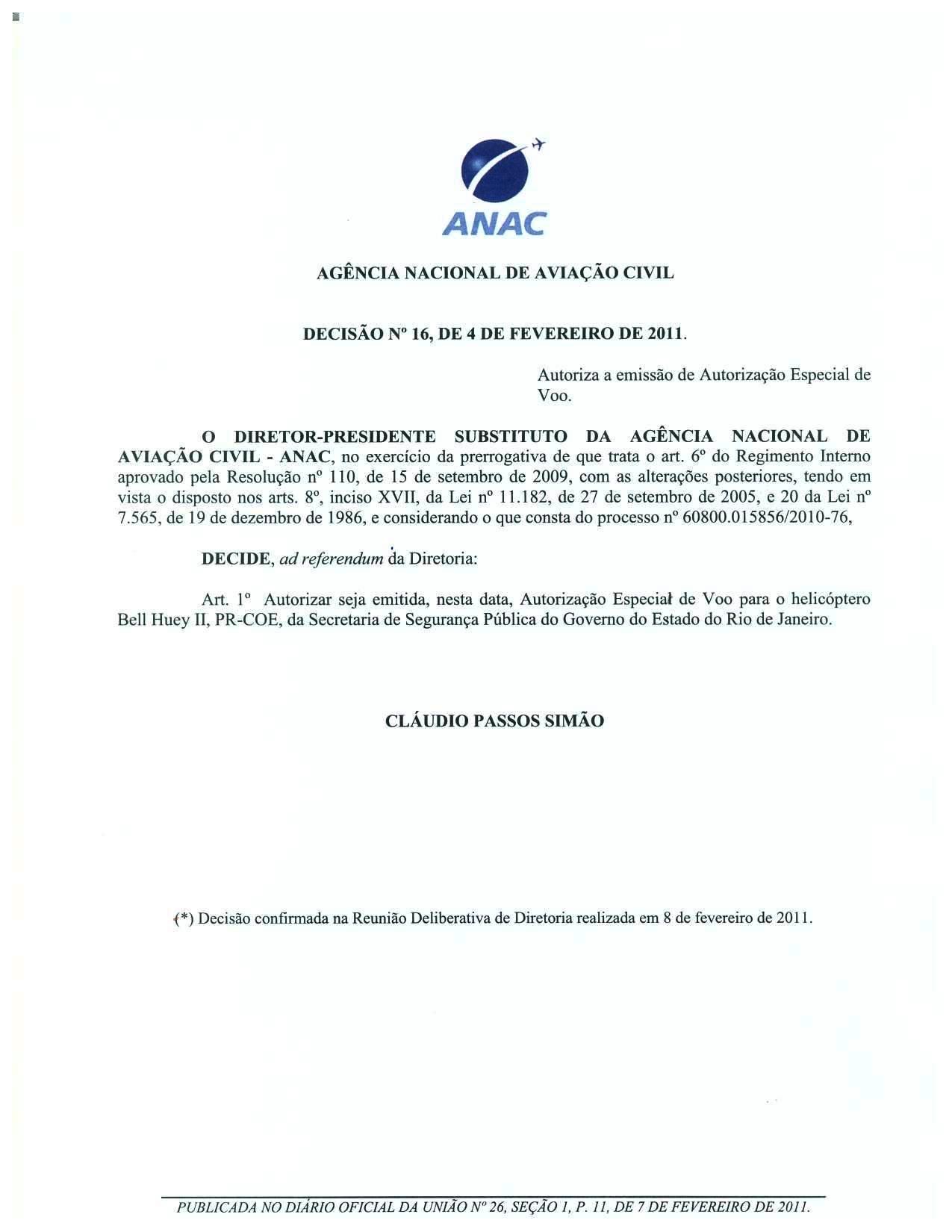 A Diretoria da ANAC confirmou a Decisão nº 16, de 4 de fevereiro de 2011, adotada ad referendum do Colegiado, que concedeu autorização para emissão de Autorização Especial de Voo para o helicóptero Bell Huey II, PR-COE, da Secretaria de Segurança Pública do Governo do Estado do Rio de Janeiro (Polícia Militar – Grupamento Aéreo e Marítimo).