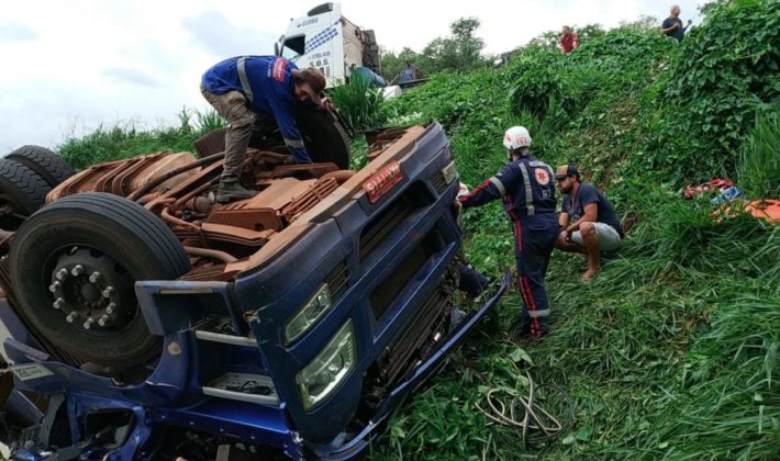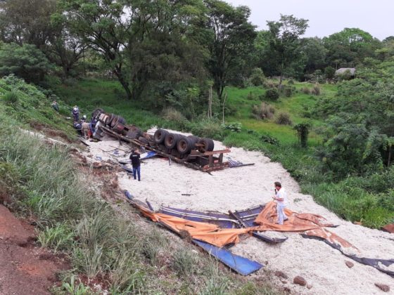 Segundo informações do CONSAMU, uma vítima ficou presa às ferragens de um caminhão que capotou em uma curva na rodovia e saiu da pista. Ele foi retirado por bombeiros e equipe da Defesa Civil de Capitão Leônidas Marques.