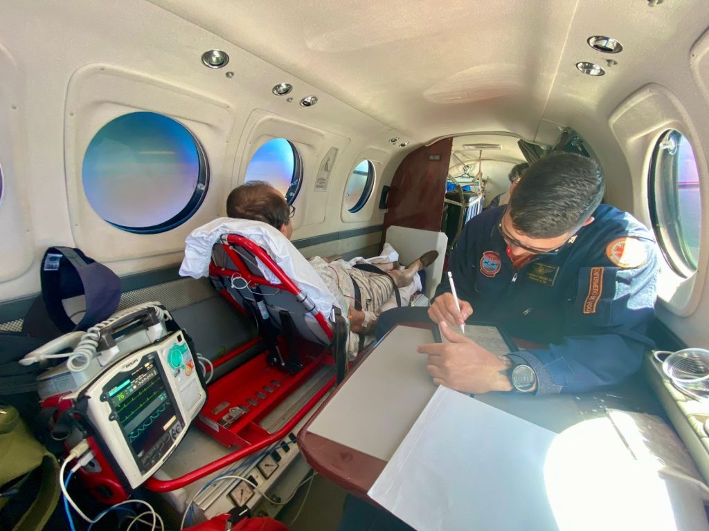 Para este tipo de transporte aeromédico, o Corpo de Bombeiros Militar conta com uma aeronave pressurizada, um KingAir, modelo C90Gti, matrícula PS-TAH, denominado “Arcanjo 06”, locada pela Secretaria de Estado da Saúde para atender pacientes do Sistema Único de Saúde (SUS).
