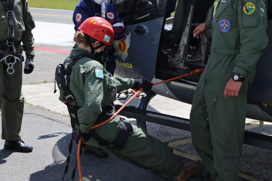 Os 21 profissionais de saúde, apresentados pela Pró-Ativo, empresa vencedora do processo licitatório realizado pelo Consórcio Intermunicipal de Saúde do Litoral do Paraná (CISLIPA), receberam treinamento teórico e prático na torre de treinamento vertical no hangar operacional do BPMOA. (saiba mais sobre a licitação)