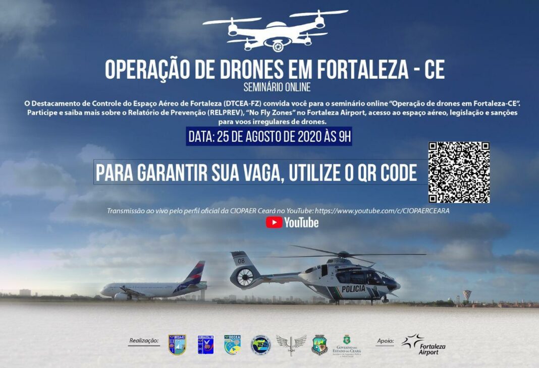 Recentemente a CIOPAER recebeu um Relatório de Prevenção com relato de presença de aeronave não tripulada em espaço aéreo proibido. Pensando na segurança das operações, a Coordenadoria Integrada de Operações Aéreas (CIOPAER), o Destacamento de Controle do Espaço Aéreo de Fortaleza (DTCEA-FZ) e a empresa Fraport Brasil, que administra o Fortaleza Airport, promovem o seminário online “Operação de Drones em Fortaleza-CE”.
