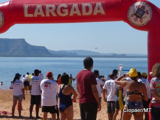 P1040873Mato Grosso – Em comemoração ao aniversário dos 150 anos da Batalha Naval do Riachuelo, 120 atletas participaram no dia 15/06 da travessia a nado do Lago de Manso (a 90 km de Cuiabá). A prova de resistência organizada pela Delegacia Fluvial de Cuiabá, premiou os participantes nas categorias Sprint (1 km) e Challenge (2 km).