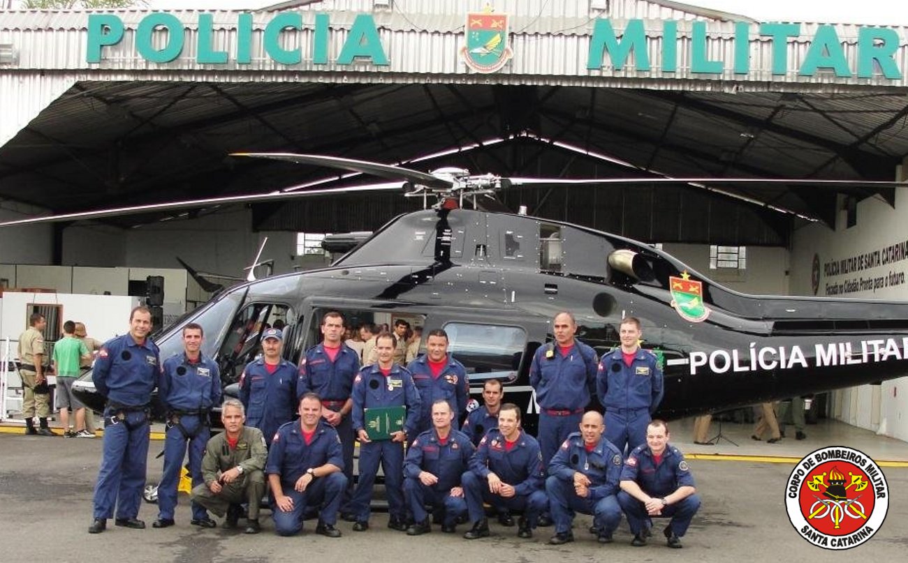 Na foto aparece a nova aeronave AW119Ke, adquirida pela PMSC, com recursos da SENASP, equipada com duas macas e guincho para içamento de 250 Kg.