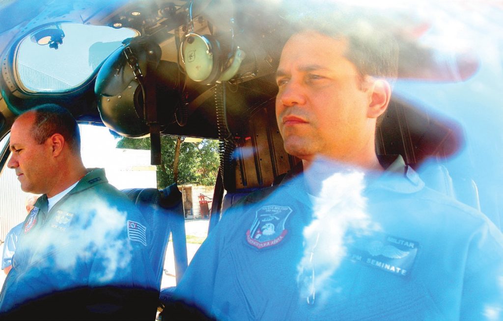 Rápidos, dois comandantes assumem seus postos no helicóptero. No banco traseiro, o chamado observador, com uma carabina Taurus ponto 30 e uma metralhadora ponto 40, ajeita-se no lado esquerdo da aeronave, ancorando o corpo em dois cintos de segurança máxima.