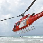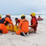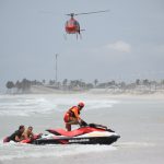 Na ocasião, foi simulado um salvamento conjugado no mar, com o emprego da técnica com o “sling’ para a retirada da vítima da água, contando com apoio de três embarcações e guarda-vidas.