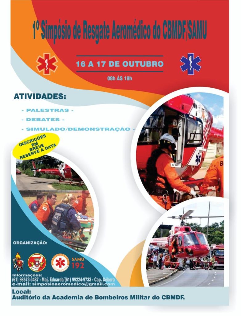 Distrito Federal – O Grupamento de Aviação Operacional (GAvOp) do Corpo de Bombeiros Militar do Distrito Federal (CBMDF) realizará o 1º Simpósio de Resgate Aeromédico CBMDF/SAMU nos dias Academia de Bombeiro Militar, Cel. Osmar Alves Pinheiro, Brasília, DF. A inscrição é gratuita.