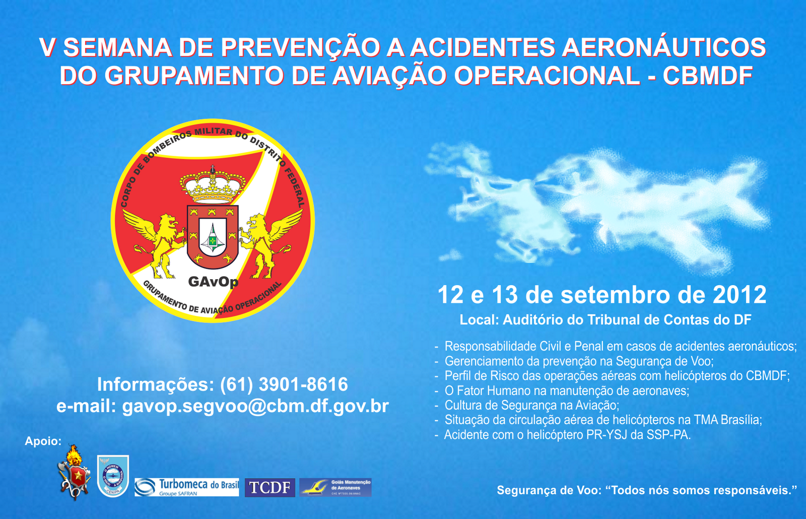 Início Corpo de Bombeiros do DF promove V Semana de Prevenção a Acidentes Aeronáuticos Maiores esclarecimentos, contatar a seção de Segurança Operacional do GAVOP no telefone (61)3901-8616.