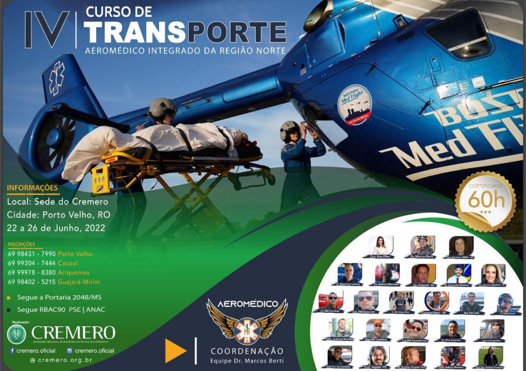Rondônia – O CREMERO se prepara para mais uma edição do Curso de Transporte Aeromédico – Integrado e da Região Norte, que acontecerá pela quarta vez nas dependências do Conselho Regional de Medicina do Estado de Rondônia, em Porto Velho, nos dias 22 a 26 de junho de 2022.