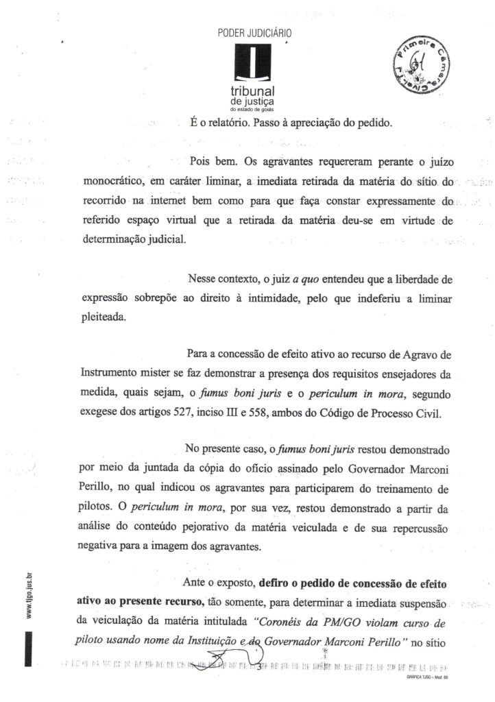 Em 31 de Janeiro de 2011 foi proferida decisão judicial que determinou a suspensão da veiculação da matéria “Coronéis da PM/GO violam curso de piloto usando nome da Instituição e do Governador Marconi Perillo”, publicada na homepage do Sindicato dos Policiais Civis do Estado de Goiás (SINPOL-GO) e reproduzida no site Piloto Policial, sob o título “Problemas no Curso de Treinamento de Adaptação de Pilotos em Goiás”.