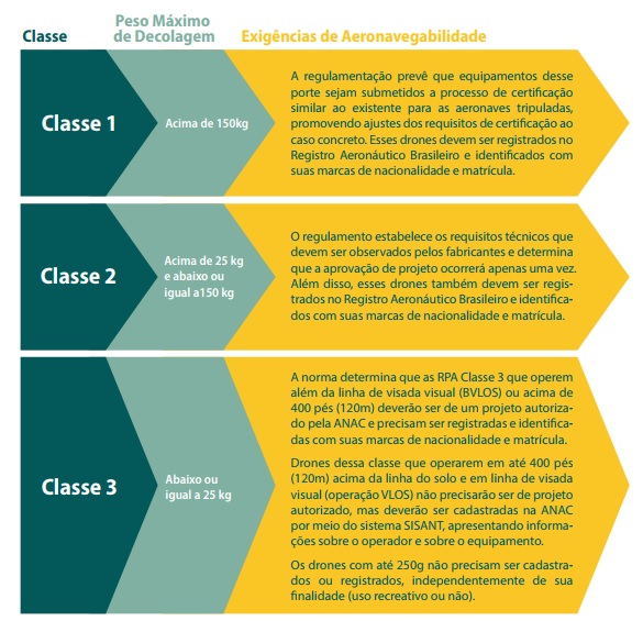 A regulamentação do uso de Drones no Brasil só foi efetivada em maio deste ano. As aeronaves remotamente pilotadas (RPA) estão divididas em três classes, de acordo com o Peso Máximo de Decolagem (PMD), no qual deve ser considerado os pesos da bateria ou combustível do equipamento e de carga eventualmente transportada. A classificação é aplicável apenas para as RPA e não para os aeromodelos.