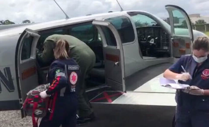 De acordo com as informações do BPMOA, o SAMU fez o atendimento inicial da vítima e devido a gravidade do caso, foi necessário solicitar apoio do avião Falcão 06 (Baron BE58) do BPMOA para o transporte aeromédico, que durou apenas 25 minutos.