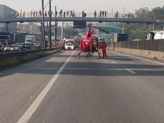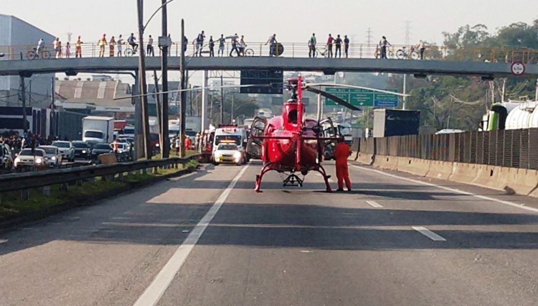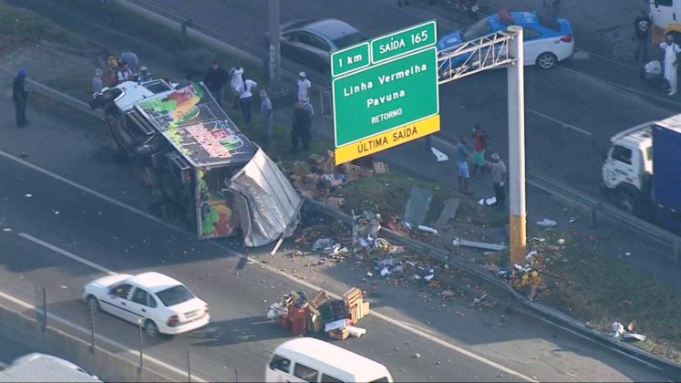 Um caminhão de frutas tombou na Rodovia Presidente Dutra e uma pessoa ficou presa às ferragens. No local, equipes do Corpo de Bombeiros realizaram o desencarceramento da vítima. Em seguida a equipe do helicóptero Bombeiro 04, composta por médico, enfermeiro e técnico de enfermagem, prestaram o primeiro atendimento de suporte a vida, preparando a vítima para o transporte por aeronave.