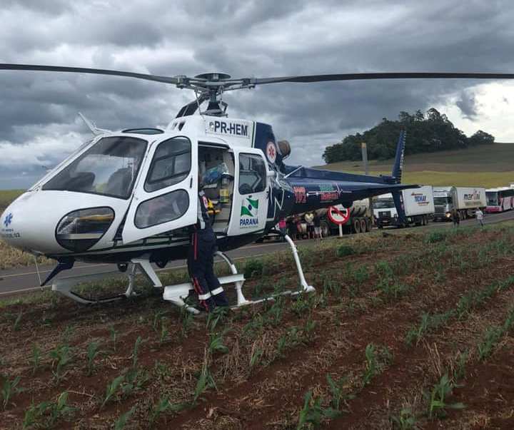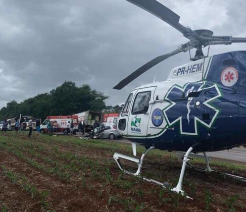 Paraná – Equipe aeromédica do Saúde 02 do Paraná Urgência, uma suporte básico do SAMU de Capitão Leônidas Marques, um suporte avançado de Realeza e a Defesa Civil atuaram juntas no atendimento de vítimas com politraumatismo grave em acidente ocorrido na tarde de segunda-feira (25).