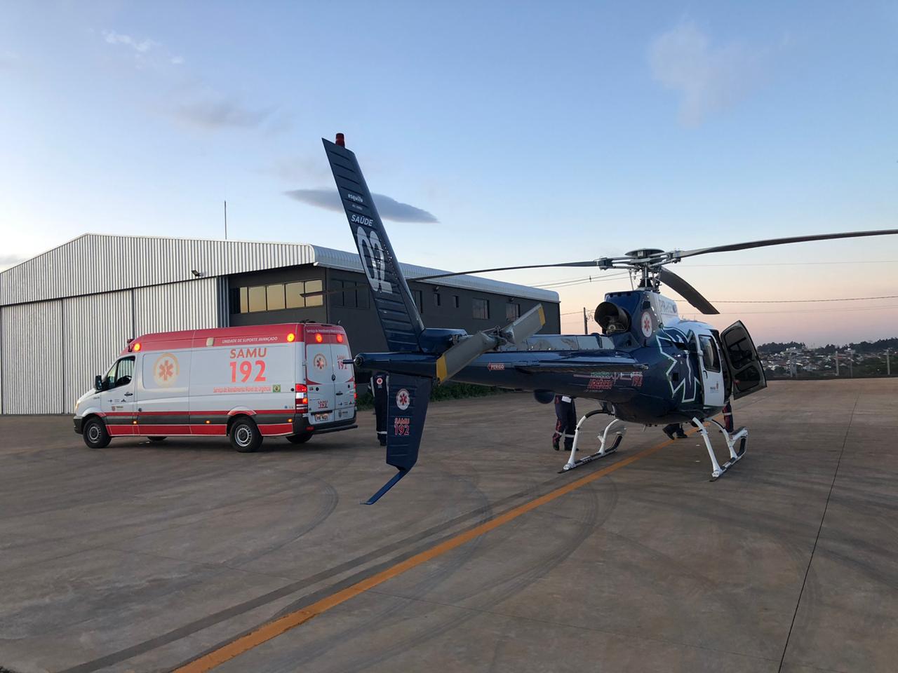Helicóptero do SAMU levou paciente de Guaraniaçu a Toledo. O homem de 65 anos estava com rebaixamento do nível de consciência e foi entubado pela equipe do aeromédico.