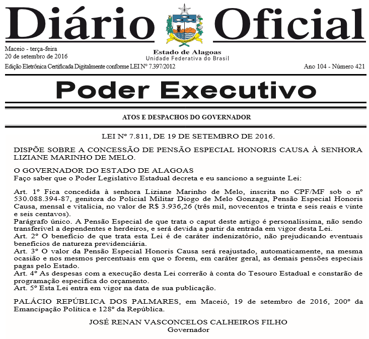 Alagoas – Em lei publicada no Diário Oficial do Estado desta terça-feira (20), o governador Renan Filho decidiu conceder pensão especial à mãe do soldado Diogo de Melo Gonzaga, morto na queda do helicóptero do Grupamento Aéreo da PM, em setembro de 2015. Liziane Marinho de Melo vai receber R$ 3.936,26 mensais.