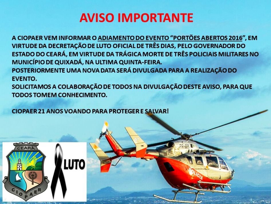 Ceará – A Coordenadoria Integrada de Operações Aéreas – CIOPAER, da Secretaria da Segurança Pública e Defesa Social do Estado do Ceará, realizará o evento “Portões Abertos 2016”, neste domingo (03), das 09h00 às 17h30min, na Base da Unidade, localizada na área operacional do Aeroporto Internacional Pinto Martins, na capital cearense.