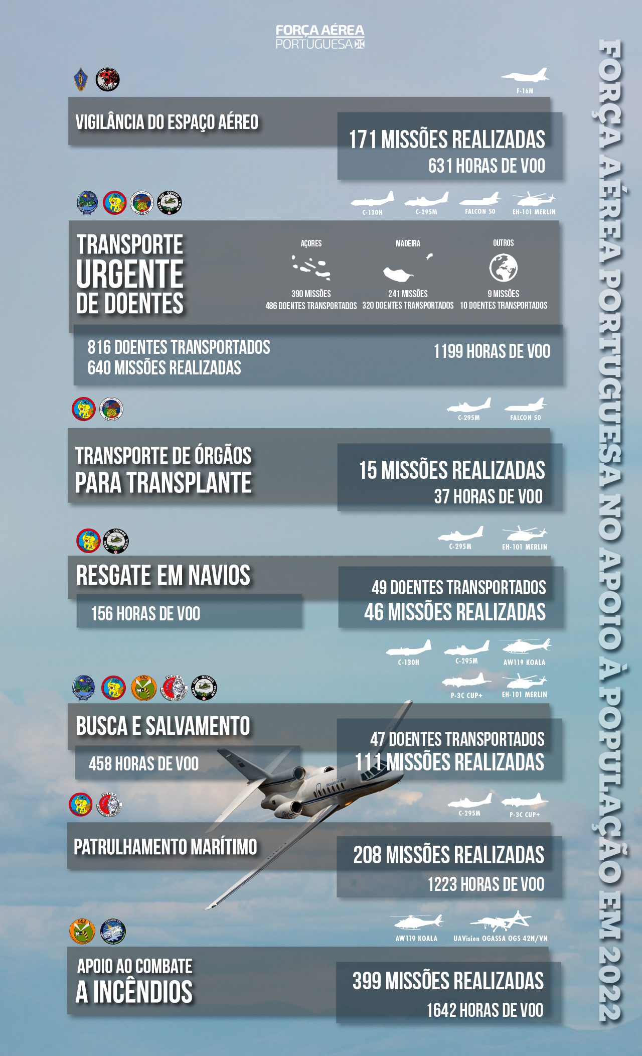 Portugal – A Força Aérea Portuguesa auxiliou diretamente 912 pessoas durante o ano de 2022, entre transportes aeromédicos, resgates e missões de busca e salvamento, em um total de 640 missões e 1.199 horas voadas. Foi o maior registo dos últimos anos.
