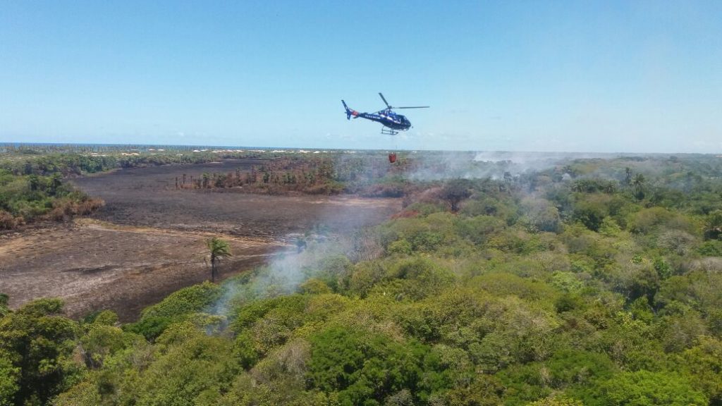 Bahia – O Grupamento Aéreo da Polícia Militar (Graer) atua em parceria com o Corpo de Bombeiros no combate a focos de incêndio que iniciaram no último domingo (26) em Mata de São João, distrito da Praia do Forte.