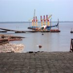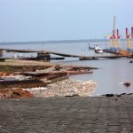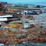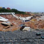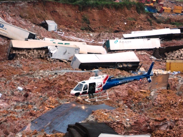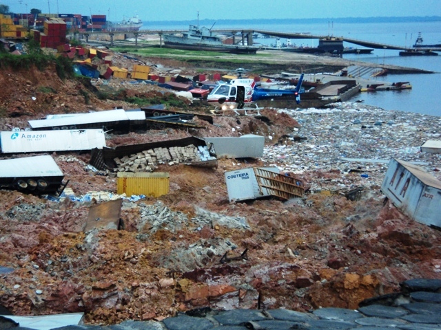 Grande parte da plataforma do Porto desabou levando a baixo toneladas de terra, carretas, containers e máquinas que ficaram soterradas.
