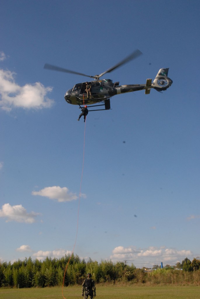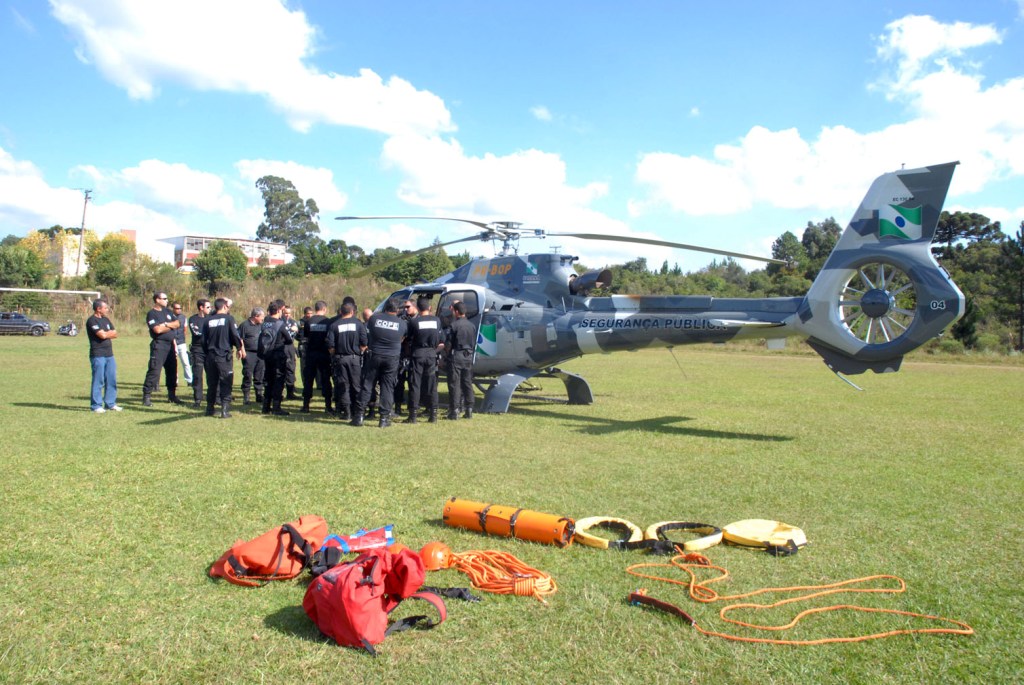 INTEGRAÇÃO – O subcomandante do Graer, capitão Valim, explicou que a aeronave pertence à Secretaria da Segurança Pública e é uma ferramenta importante em operações policiais e de salvamento em todo o Estado. O Graer conta hoje 43 integrantes, sendo sete policiais civis, entre eles um delegado e seis investigadores, e 36 policiais militares e bombeiros. Também colaboraram com o treinamento o capitão Fávero, comandante de aeronave do Graer, e o delegado Renato Coelho.