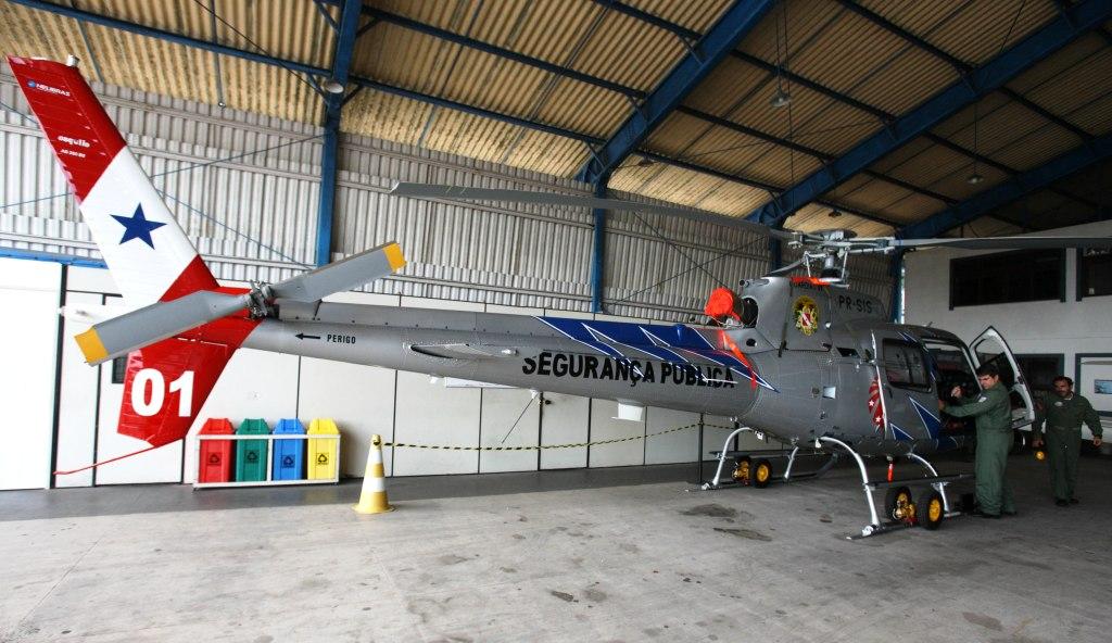 Helicóptero modelo Esquilo AS 350 B2, pertencente à frota do Grupamento Aéreo de Segurança Pública (GRAESP), órgão que compõe o Sistema de Segurança Pública e Defesa Social do Estado do Pará.