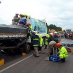 No local estavam guarnições do 6° Grupamento de Bombeiros e Socorristas da Concessionária Arteris em atendimento à colisão entre dois caminhões, um deles tratava-se de um caminhão de coleta de lixo.