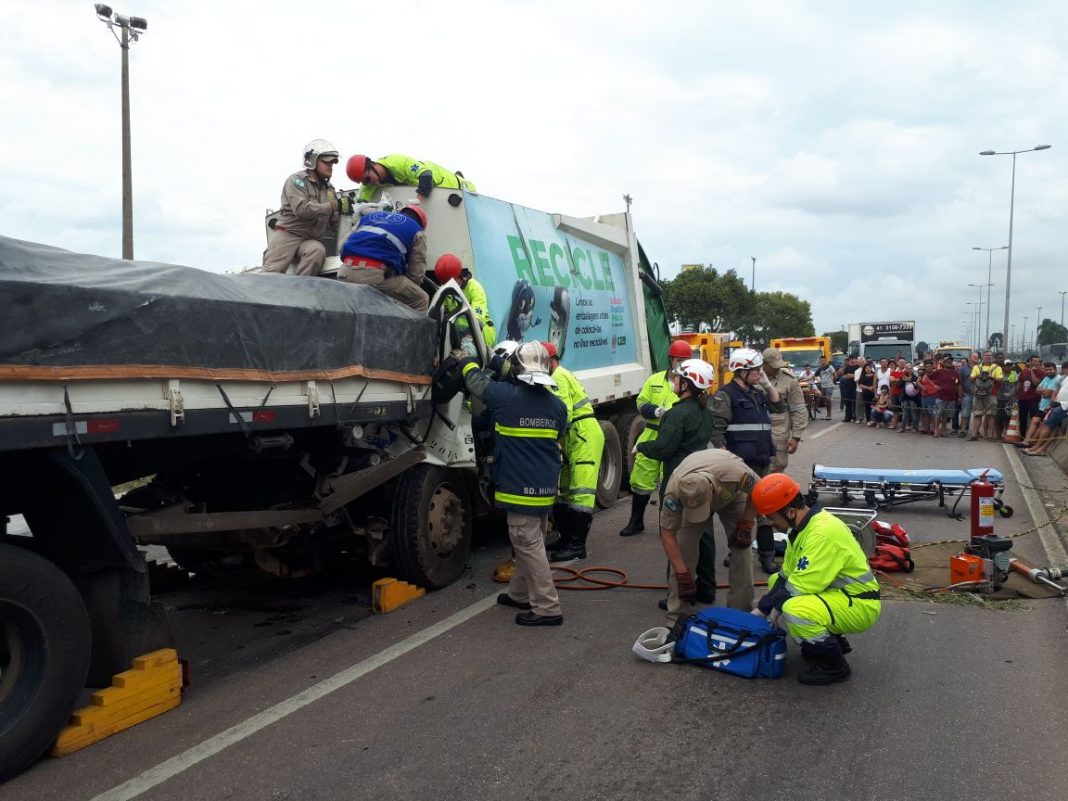 A única vítima em estado grave era o motorista do caminhão de lixo, o qual colidiu na traseira de outro caminhão e ficou preso nas ferragens, sendo necessária utilização de equipamentos e técnicas de desencarceramento.
