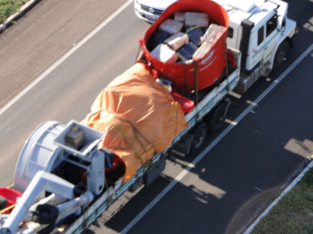 Mato Grosso do Sul – Às 15 horas e 15 minutos, uma equipe policial da Divisão de Operações Aéreas da Base do Mato Grosso do Sul, em voo de patrulhamento com a Aeronave EC 120 B – Colibri, na BR 163 Norte em sentido ao Posto de Jaraguari, visualizou no KM 521 da referida BR, um veículo da marca Scânia 112 de cor branca de placas ABG-0437 e HOY-4639 – RS, que conduzia equipamentos agrícolas e dentro de alguns equipamentos, visto por cima, existiam algumas caixas acondicionadas, além de outras caixas cobertas por lonas.