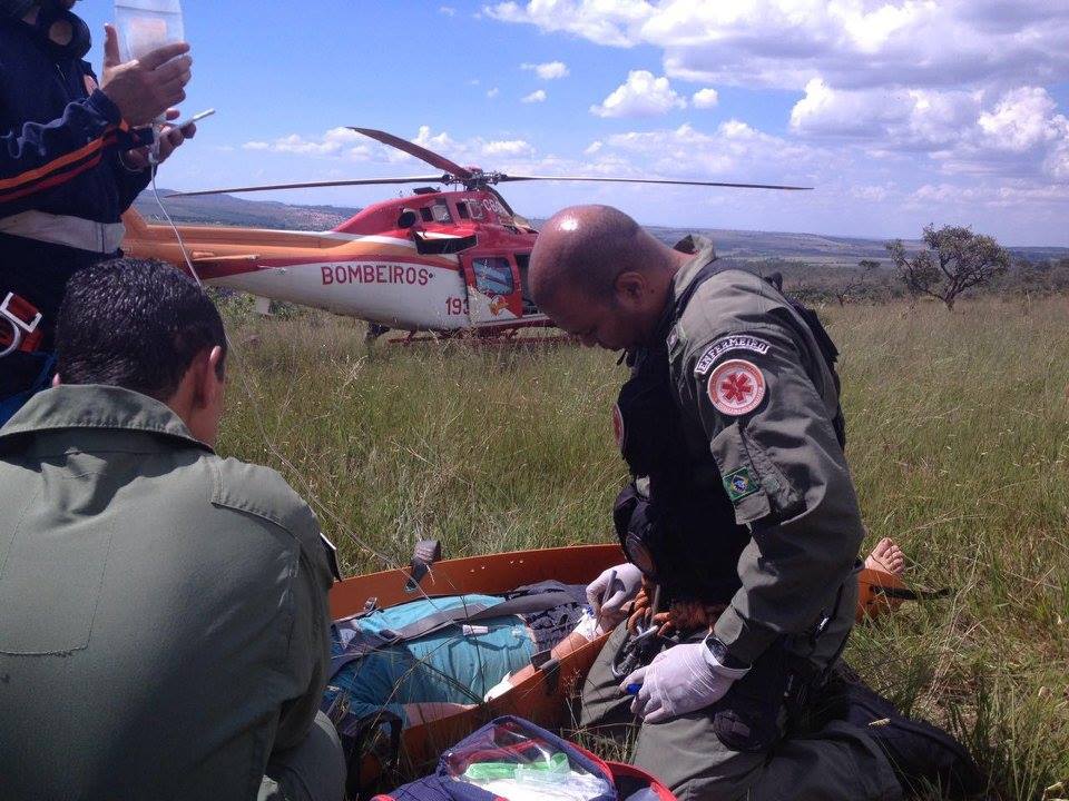 A equipe aérea do helicóptero Bombeiro 01 realizou atendimento pré-hospitalar no local e transportou a vítima, que estava consciente com suspeita de fratura no tornozelo esquerdo, para um hospital em Anápolis.