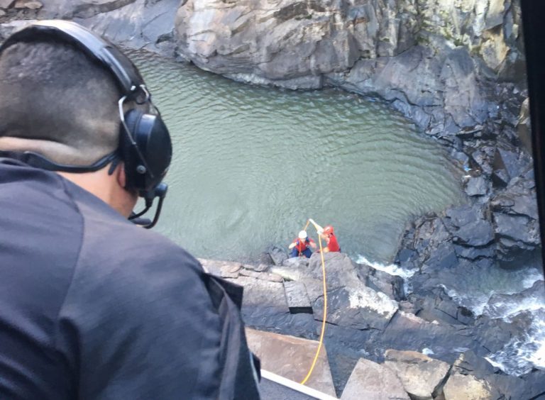 Início Helicóptero do SAERFron realiza salvamento de vítima de queda em cachoeira Vítima foi encontrada caída entre as pedras de uma cachoeira (Foto: Corpo de Bombeiros)