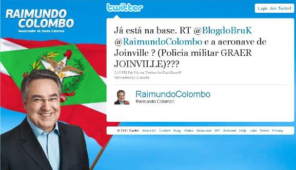 A questão da indisponibilidade da aeronave da 2a. Cia do BAPM/SC de Joinville está causando uma grande polêmica em Santa Catarina, chegando ao ponto do Governador do Estado ter de responder tal pergunta via Twitter.