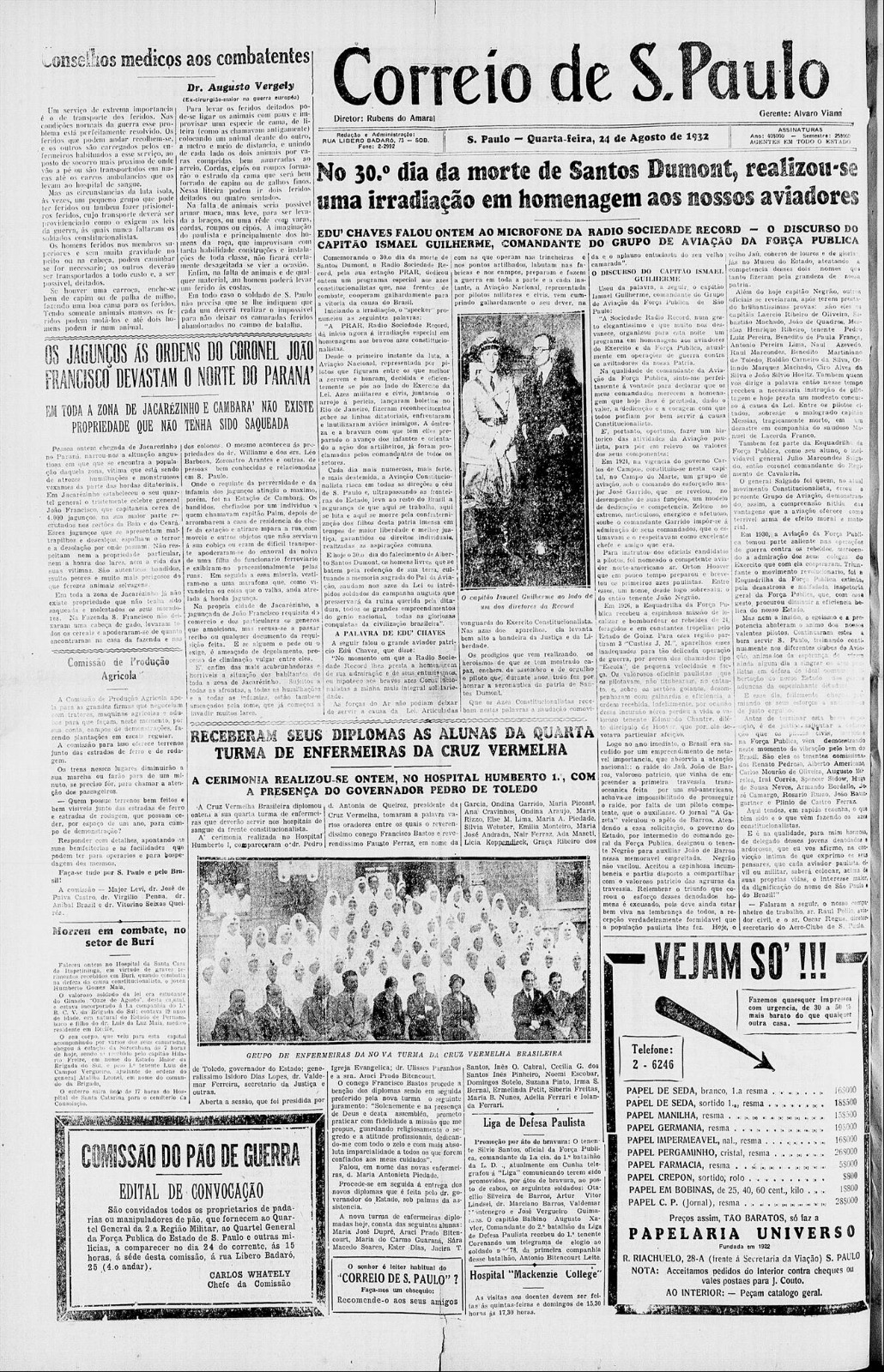 Publicamos a seguir, na íntegra, dois textos. O primeiro é seu discurso proferido na noite do dia 23 de agosto de 1932, em um programa especial da Rádio Sociedade Record, em homenagem aos aviadores da Força Pública de São Paulo, do Exército e ao 30º dia da morte de Santos Dumont, pai da aviação.