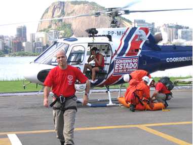 Os oficiais médicos de serviço, Capitães BM Edson e Heron, participaram da apresentação, mostrando os diversos recursos. Ao final, em conjunto com os militares do Destac/GOA, foi feita uma simulação de resgate, com o emprego da técnica de descida de rapel da aeronave.