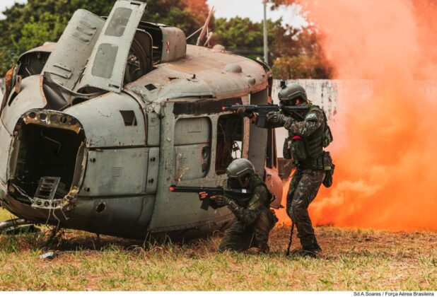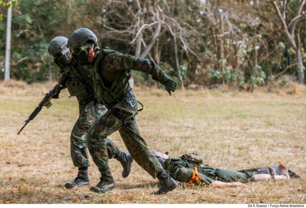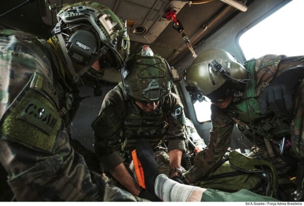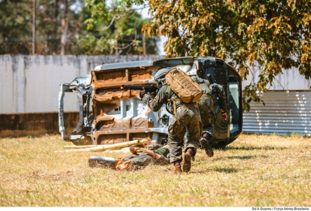 O terreno está ocupado por insurgentes armados e um dos combatentes é vítima de emboscada do inimigo, necessitando de apoio médico. O cenário simulado e desafiador para os militares da Força Aérea Brasileira (FAB) integra o curso de Atendimento Pré-Hospitalar Tático (APHT), no âmbito do Exercício Conjunto (EXCON) Tápio 2021, realizado na Base Aérea de Campo Grande (MS).