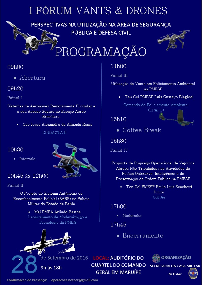 O último painel falará sobre a Proposta de Emprego Operacional de Veículos Aéreos Não Tripulados nas Atividades de Polícia Ostensiva, Inteligência e de Preservação da Ordem Pública da Polícia Militar de São Paulo, e será apresentado pelo Ten Cel PMESP Paulo Luiz Scachetti Junior do GRPAe da PM de São Paulo.