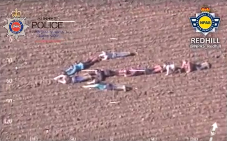 O caso aconteceu em Surrey, Inglaterra, na sexta-feira de Páscoa, mas só agora foi tornado público. Um helicóptero da polícia procurava um grupo de ladrões num campo onde se encontrava jovens brincando. Estes, que tinham visto desconhecidos passar pelo local, resolveram deitar-se no chão e desenhar uma seta humana com os seus corpos, apontando para o local onde julgavam estar os assaltantes.