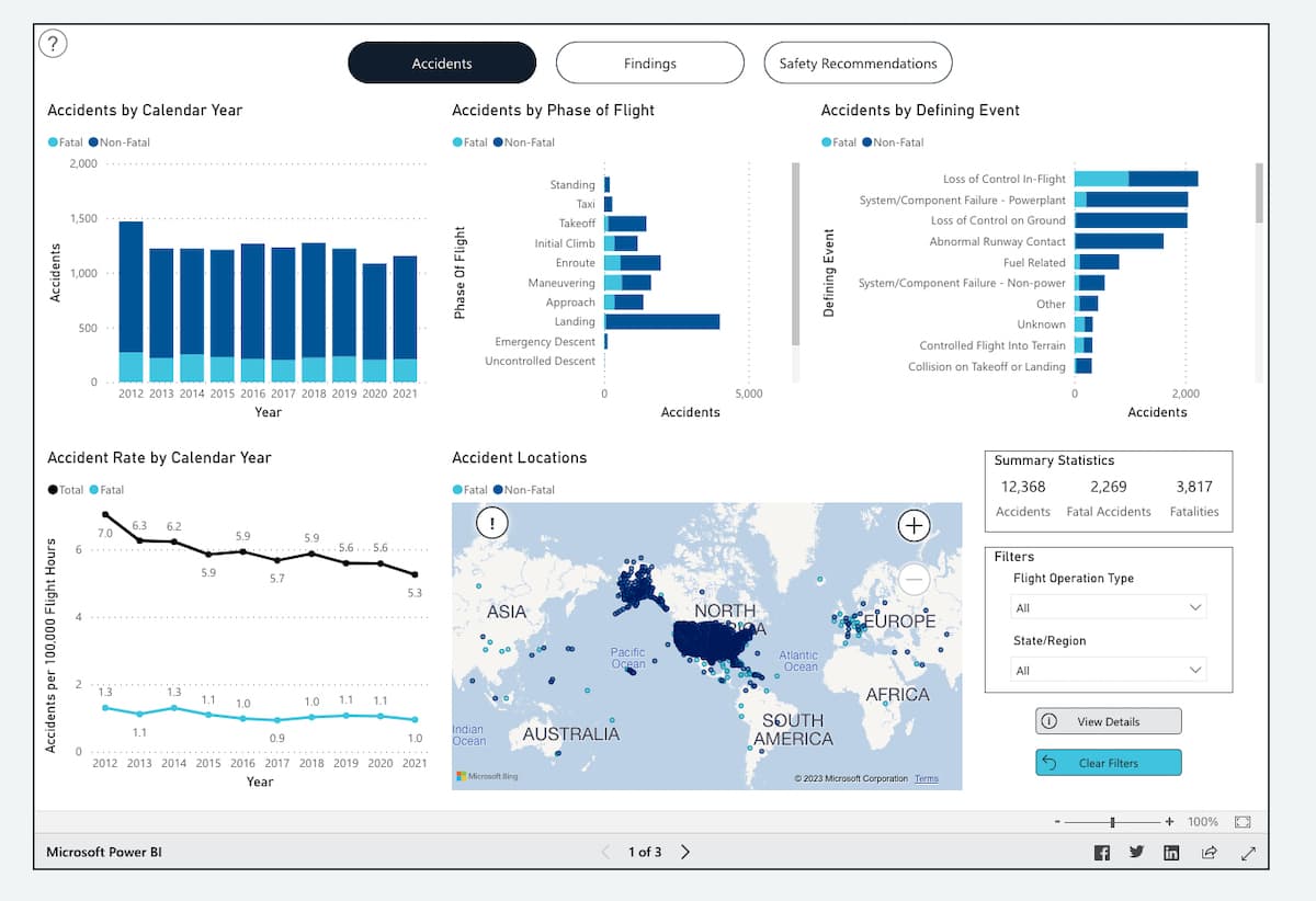 O Painel de Acidentes da Aviação Geral fornece estatísticas resumidas, resultados investigativos e recomendações de segurança para acidentes de aviação geral de 2012 a 2021 e permite que os usuários exibam de forma mais intuitiva informações de acidentes, relatórios e estatísticas, selecionando um ou mais filtros para ano, local, fase do voo e evento definidor.