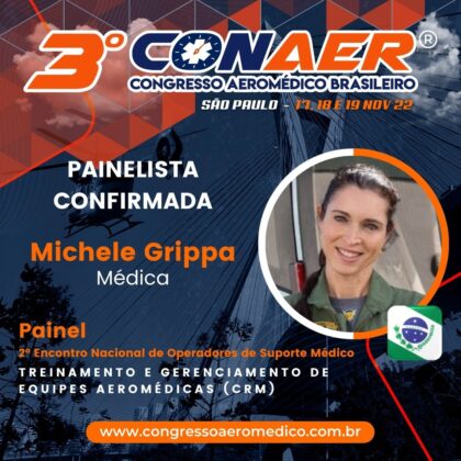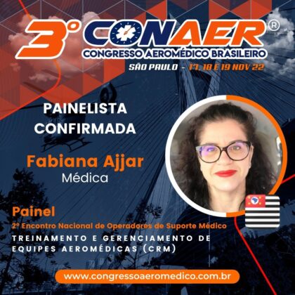 A programação do 3º CONAER prevê o 2º Encontro Nacional de Operadores de Suporte Médico com o tema treinamento e gerenciamento de equipes aeromédicas (CRM). As médicas Fabiana Maria Ajjar (CAv PMESP) e Michele Mamprim Grippa (SIATE/BPMOA PR) e os enfermeiros José Lucio de Souza Macêdo (SAMU/CIOPAER CE) e Herberth Jessie Martins (SAMU/GAVOP CBMDF) serão os protagonistas do painel.