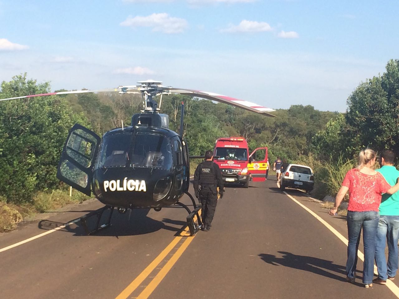 O helicóptero “Polícia 02” do SAER de FRONTEIRA da Polícia Civil, resgatou uma criança de 02 anos, também passageira do fusca. A criança resgatada passa bem no hospital Materno Infantil na cidade de Chapecó/SC.
