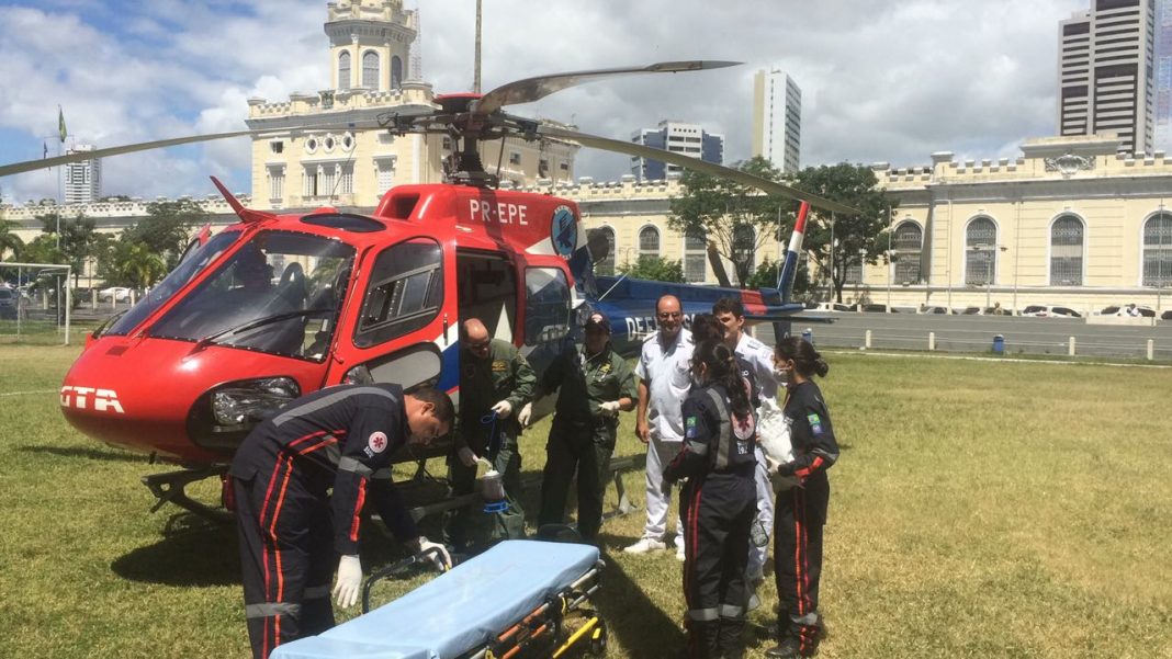 Policial militar baleado em ocorrência de roubo é resgatado de helicóptero, em Pernambuco