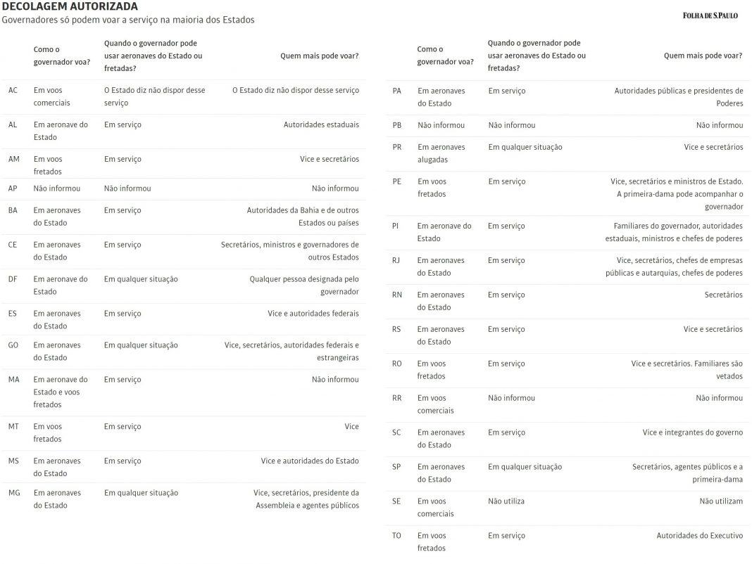 Segundo levantamento da Folha, em 18 Estados o uso de aeronaves por integrantes do Executivo é permitido apenas nos deslocamentos em serviço, segundo lei, norma ou decisão do governador.