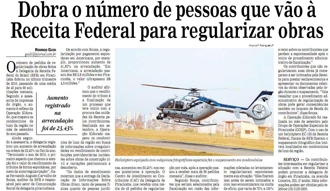 O número de pedidos de regularização de obras feitos à Delegacia da Receita Federal do Brasil (RFB) em Piracicaba dobrou no último trimestre de 2010, passando de uma média de 45 para 90 solicitações mensais.
