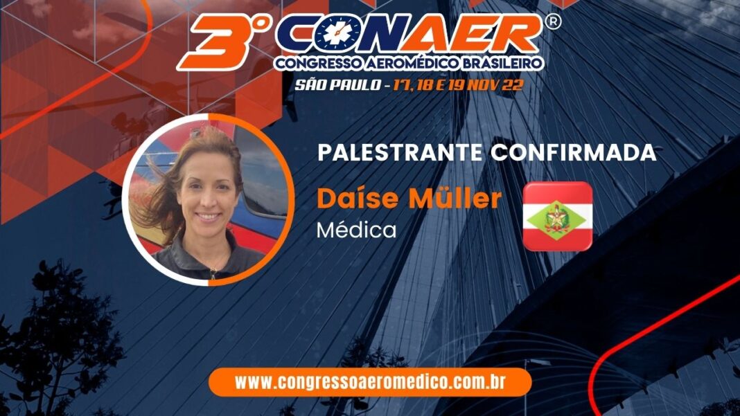 A programação do 3º CONAER prevê a palestra sobre Sangue total no serviço aeromédico: Uma parceria GRAU/CBMSC/HEMOSC. A médica Daíse Esswein Müller será a palestrante. Ela é operadora de suporte médico das aeronaves Arcanjo do Corpo de Bombeiros Militar de Santa Catarina.